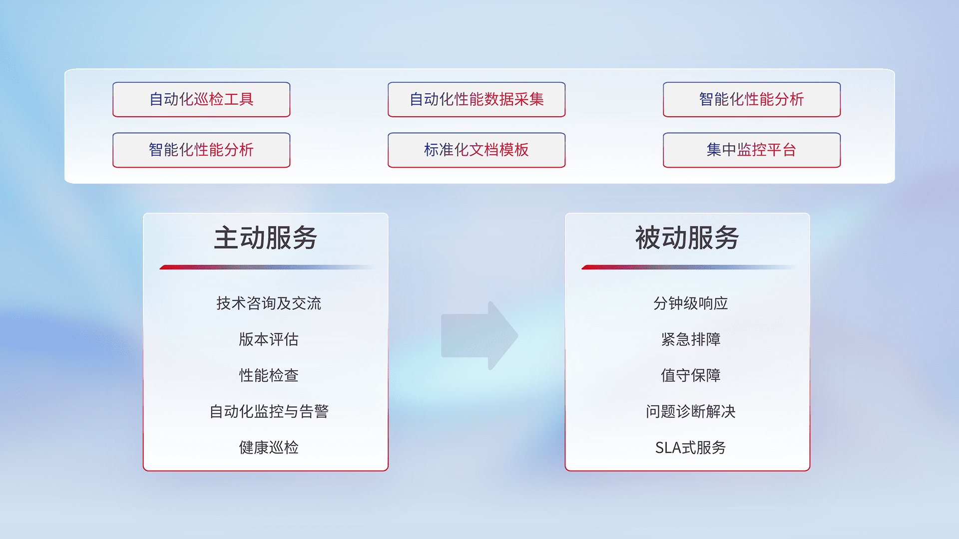 智能化工具和标准化文档,,,,保障服务质量,,,,提供主动服务(包含技术咨询、、版本评估、、、、性能检查、、自动化监控与告警、、健康巡检)和被动服务包含(分钟级响应、、、紧急排障、、值守保障、、、问题诊断解决、、、SLA服务)。。。。