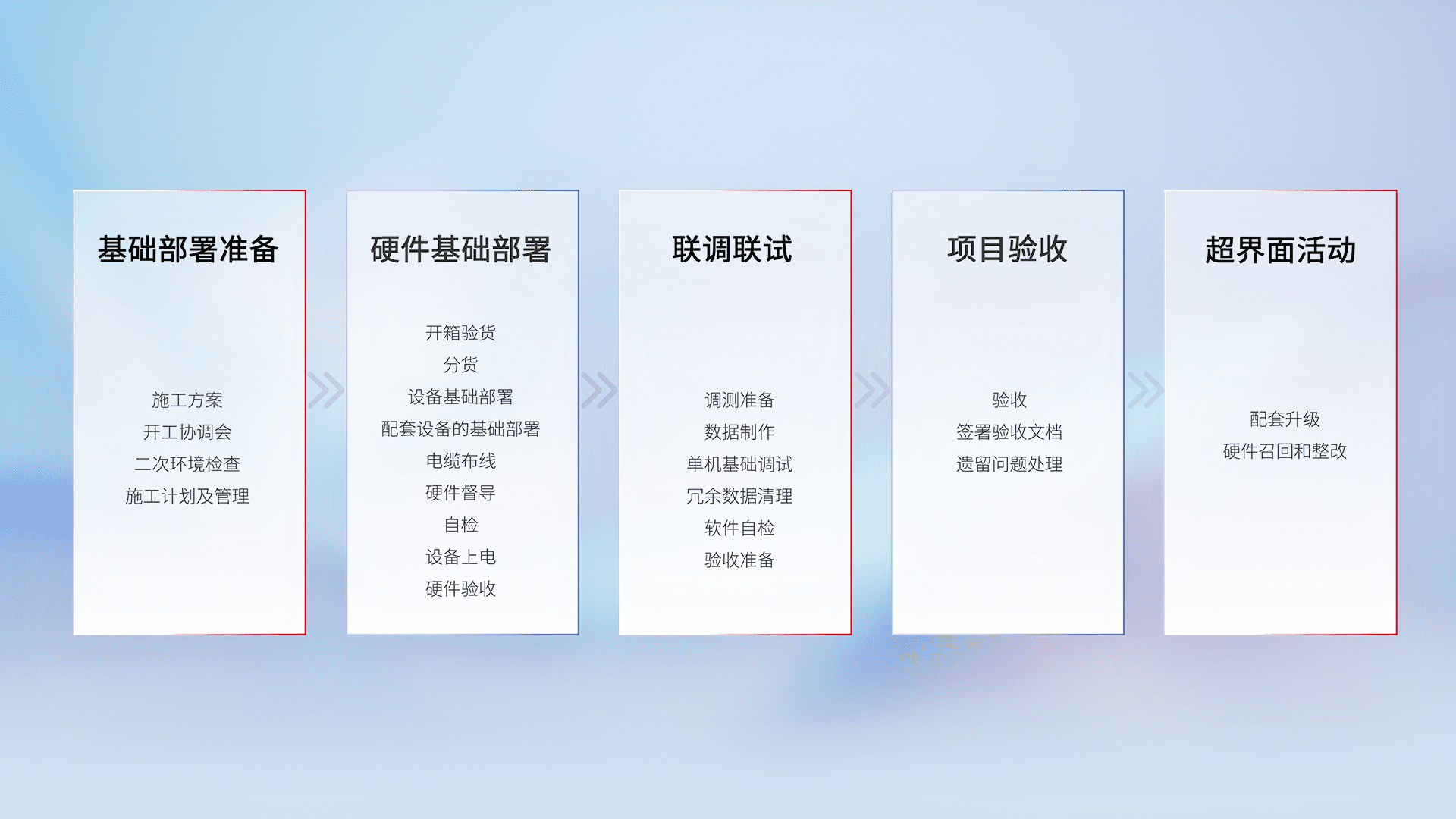 从基础部署准备、、、硬件基础部署、、、、联调联试、、项目验收、、、、越界面活动的全过程可追溯,,,保证施工质量和进度。。。。